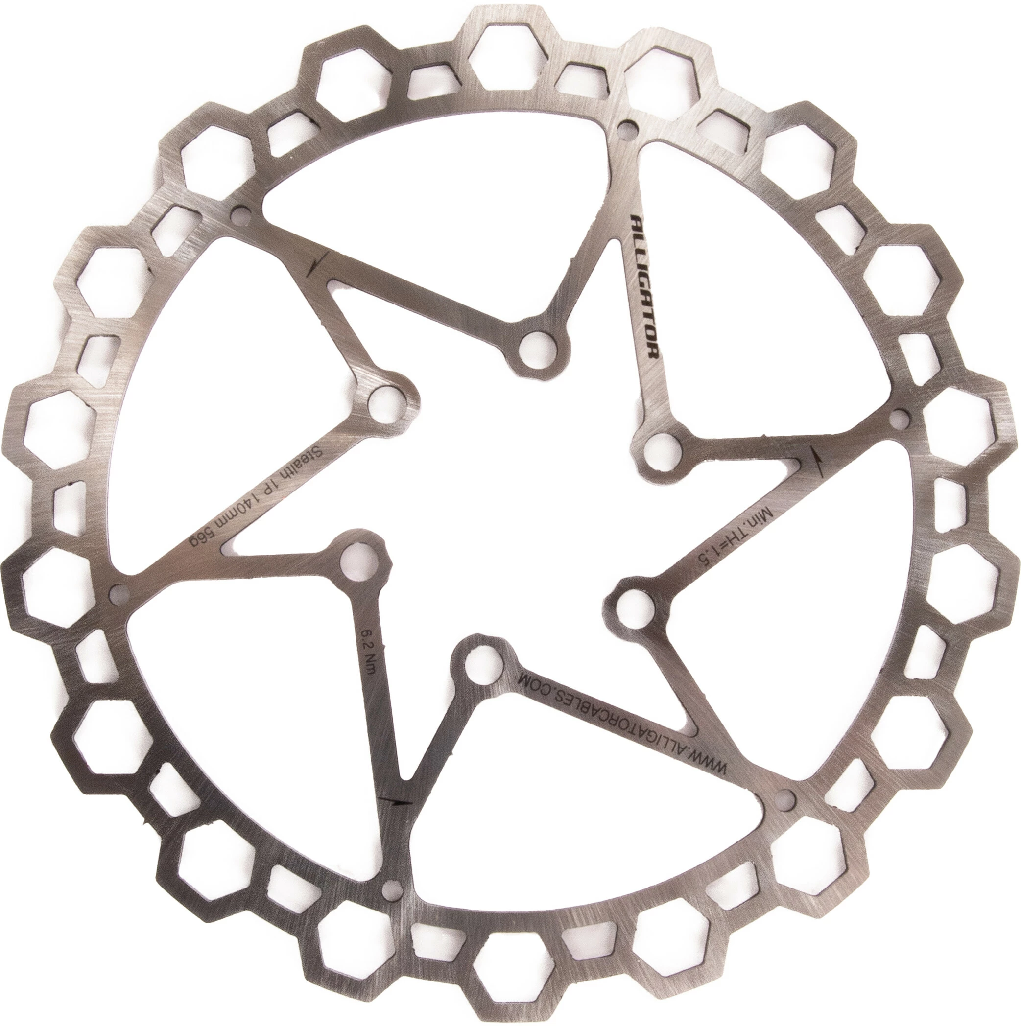 Den lette rustfri stål SUS 410 blandt Alligators bremseskiver Den har en meget let konstruktion og vejer 56 g med en diameter på 140 mm, hvilket er 30 % mindre end resten af bremseskiverne.